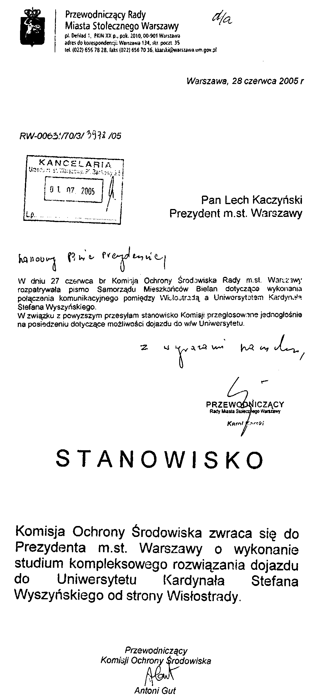5. W wypracowywanie rozsądnego kompromisu zaangażowało się w latach 2005-2006 wiele osób, zarówno z samorządów i organizacji społecznych, jak rad miasta i dzielnicy. Byli wśród nich Wiesław Drzewiecki (PiS), Kacper Pietrusiński (PO), Andrzej Szewielow (PiS) i Antoni Gut (LPR). Dlaczego dziś pomija się ten dorobek i pewne ustalenia, które w świadomości społecznej Bielan funkcjonują jako obowiązujące?
