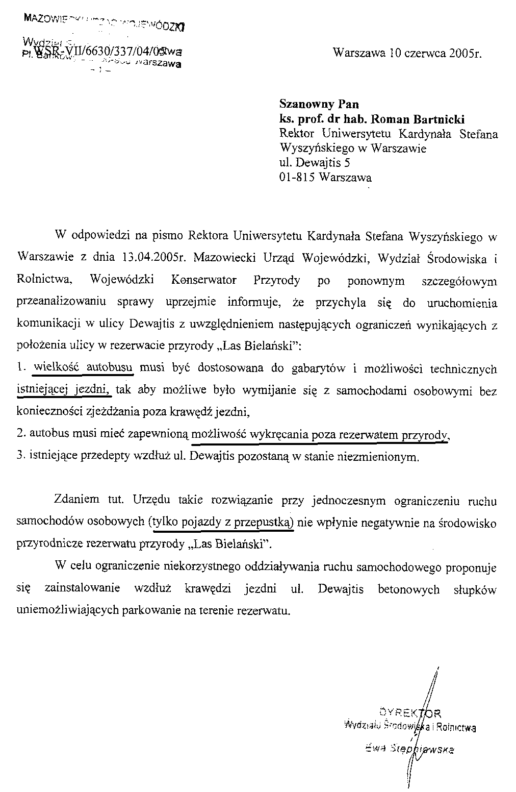3. Plany poszerzenia jezdni i budowy chodnika dla pieszych na odcinku ul. Dewajtis biegnącym przez rezerwat są sprzeczne z opinią Wojewódzkiego Konserwatora Przyrody [pismo Pismo WŚR VII/6630/337/04/05 z 10.06.05 r. do Rektora UKSW: PNG, 34 kB]