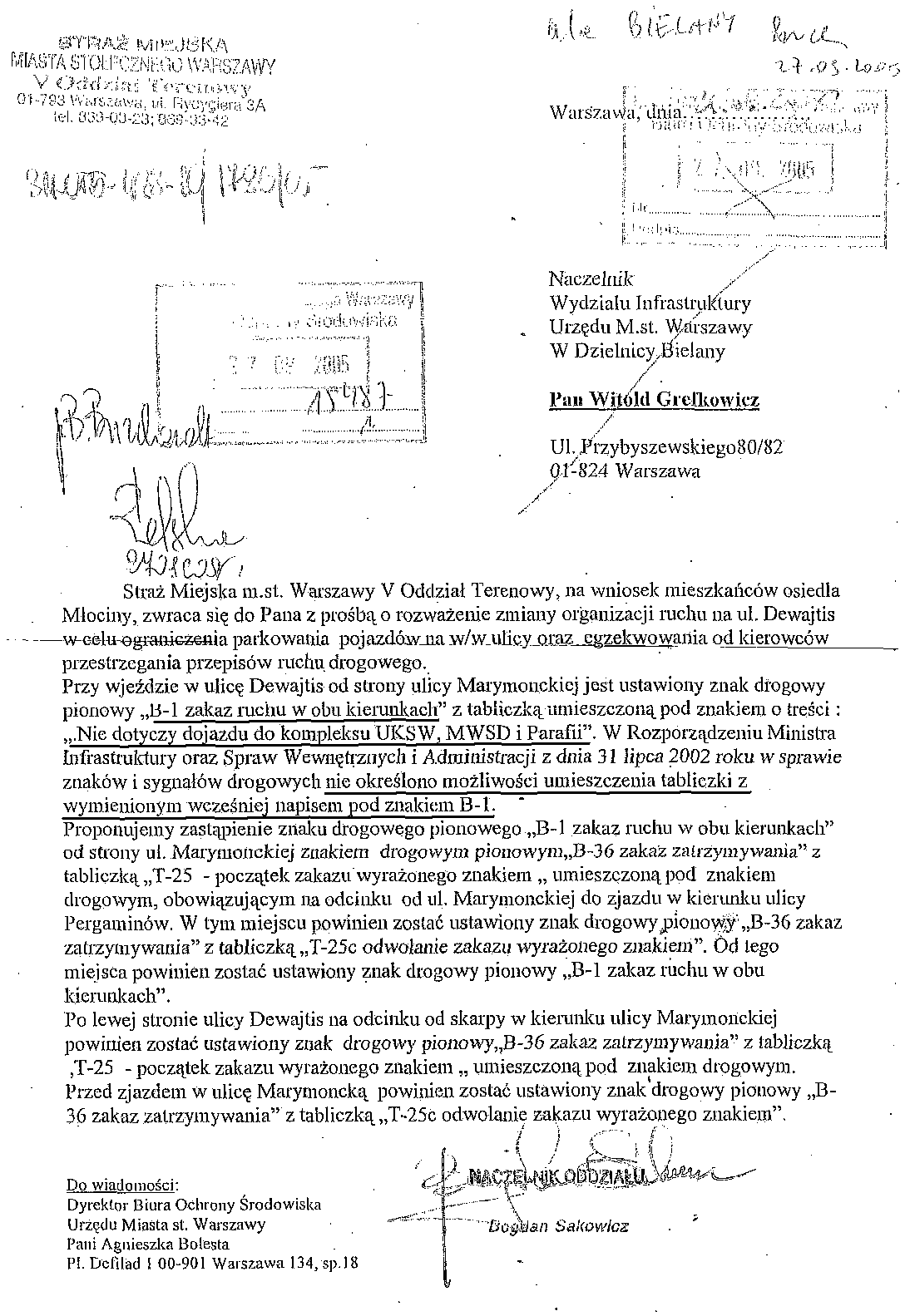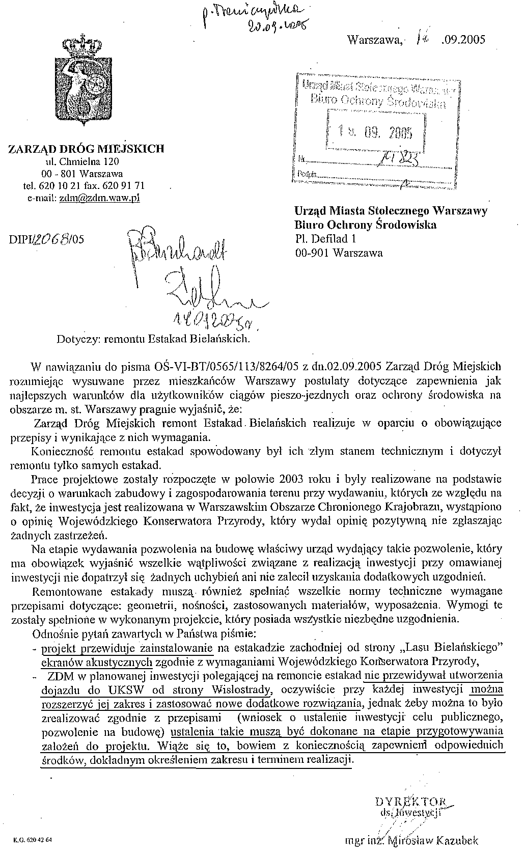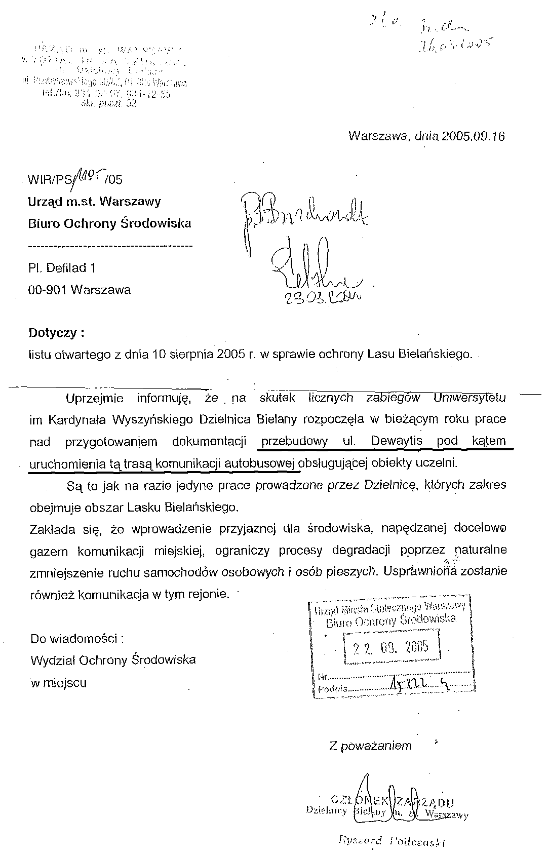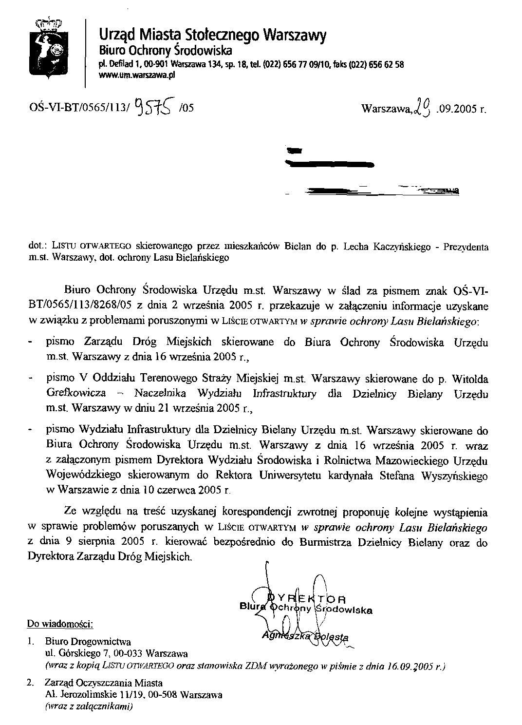 12. wrzesień 2005: Zarząd Dzielnicy Bielany -> Biuro Ochrony Środowiska W-wy PNG, 36 kB
