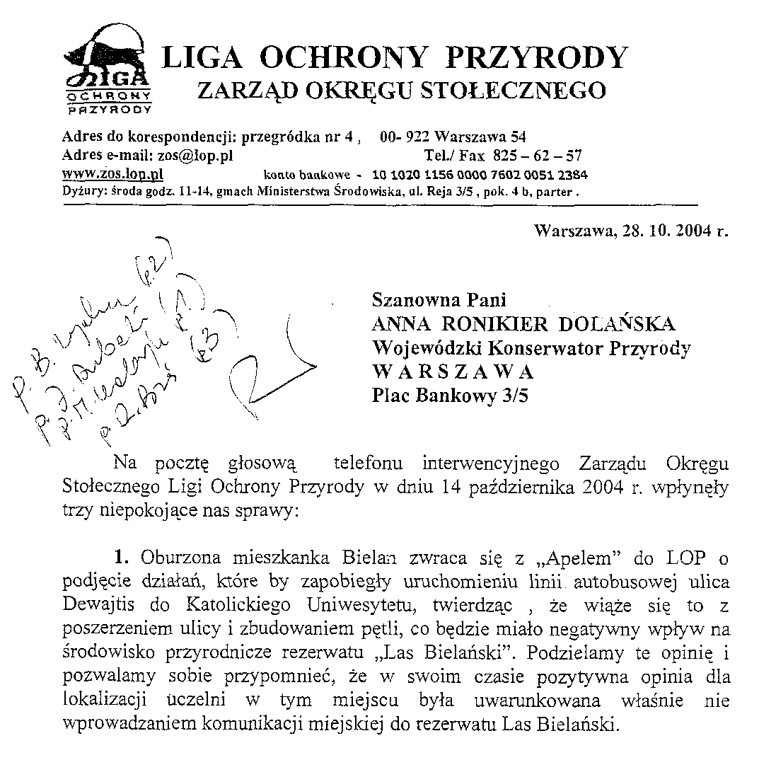 Udostępniamy kopie otrzymanych pism, z których część wymieniono w tekście. Są to oficjalne dokumenty dobrze ilustrujące stanowiska różnych podmiotów w sprawie ochrony Lasu Bielańskiego w ciągu ostatnich lat.