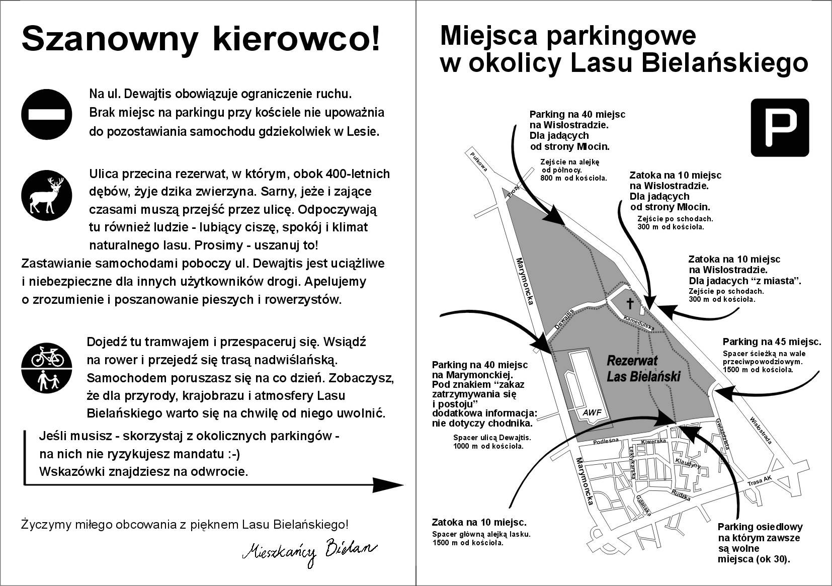 W trakcie akcji zbierania podpisów w Lasku tylko nieliczne osoby przechodziły obojętnie. Przeważająca większość wyrażała poparcie dla akcji, a wielu oburzenie motoryzacyjnym potopem. Czy po to likwidowano w lesie place zabaw, by teraz niszczyły go samochody? - spytała jedna z mieszkanek. Nasza grupa systematycznie powiększała się o kolejnych mieszkańców Bielan i miłośników Lasu chętnych nie tylko do narzekania, ale i działania. Dzięki ogłoszeniom akcja dotarła nawet do jednej z żoliborskich szkół podstawowych, gdzie dzięki zaangażowaniu nauczycieli i uczniów udało się zebrać kilkadziesiąt podpisów. List poparły łącznie 843 osoby! Dziękujemy wszystkim, a szczególnie biorącym czynny udział w akcji.