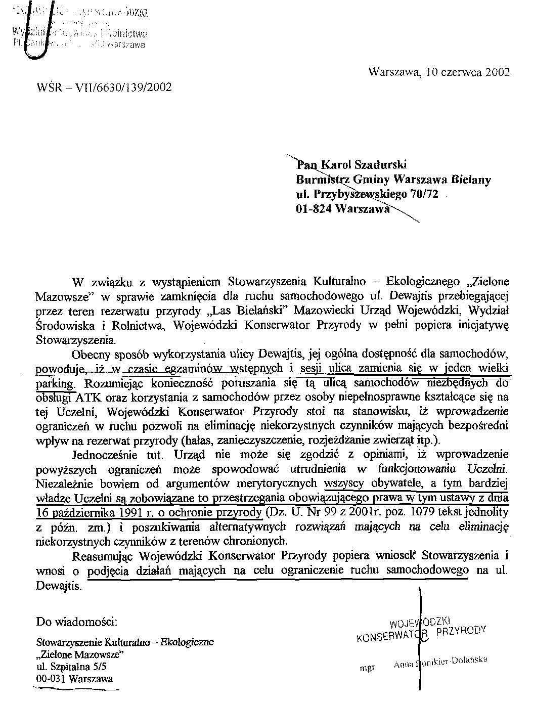 List otwarty nie dotyczył błahostek. Nieprzypadkowo dołączyliśmy do niego przygotowany przez fachowe autorytety Raport o wartości i stanie przyrody Lasu Bielańskiego. BOŚ i Zarząd Dzielnicy reagują jednak tak, jakby wygoda kierowców znaczyła dla nich więcej niż dobro rezerwatu, bądź co bądź chronionego prawem.