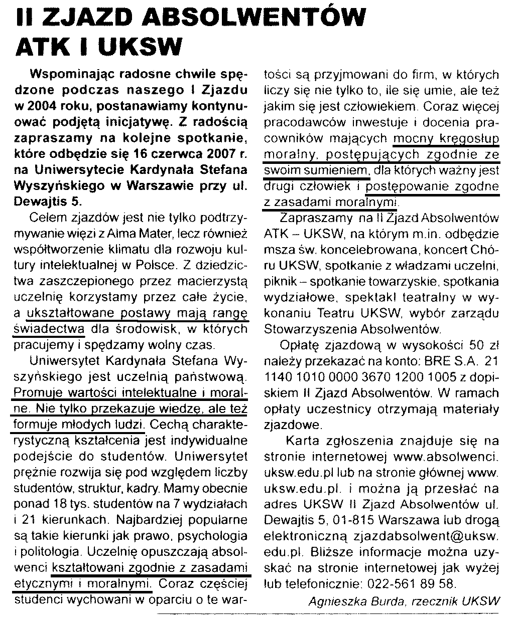 Na łamach majowego numeru miesięcznika "Nasze Bielany" ukazało się zaproszenie na zjazd absolwentów ATK i UKSW. Rzeczniczka UKSW zawarła w nim kilka ciekawych opinii o tej uczelni, wartych przywołania w kontekście stanowiska jej przedstawicieli [zobacz >>>] w odpowiedzi na wystąpienie Biura Ochrony Środowiska [zobacz >>>], manipulacji samorządu studentów UKSW kwestią dojazdu [zobacz >>>] oraz stosunku UKSW do prawnie chronionej przyrody będącej dziedzictwem i bogactwem narodowym [zobacz >>>] [zobacz >>>]. Publikujemy poniżej fragmenty tego tekstu (tytuł od redakcji).