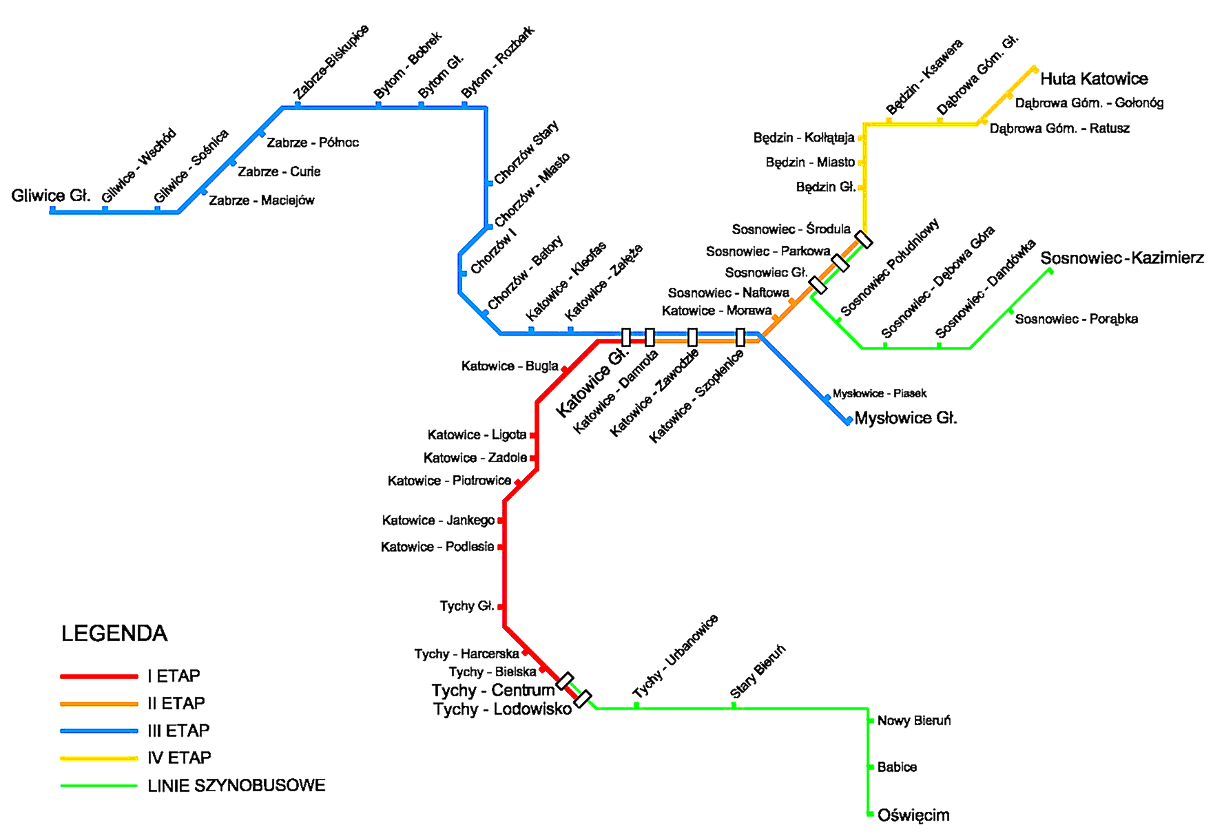 Dopiero w drugim etapie autorzy proponują budowę dodatkowych przystanków w Katowicach - w rejonie kąpieliska Bugla, przy ul. Jankego, oraz modernizację przystanku Podlesie. Wtedy też linia miałaby zostać wydłużona do Sosnowca, z przystankami w Katowicach: Zawodzie, Szopienice, Morawa, i Sosnowcu: Naftowa, Sosnowiec Gł., Parkowa, Środula. Ostatni przystanek, dzięki stworzeniu skorelowanych linii autobusowych objeżdżających osiedle Środula oraz Pogoń, znacznie poprawi komunikację tej części miasta, która zresztą wykazuje bardzo silne ciążenia do Katowic. Dla wielu pasażerów czas dojazdu do pracy może skrócić się nawet o połowę!